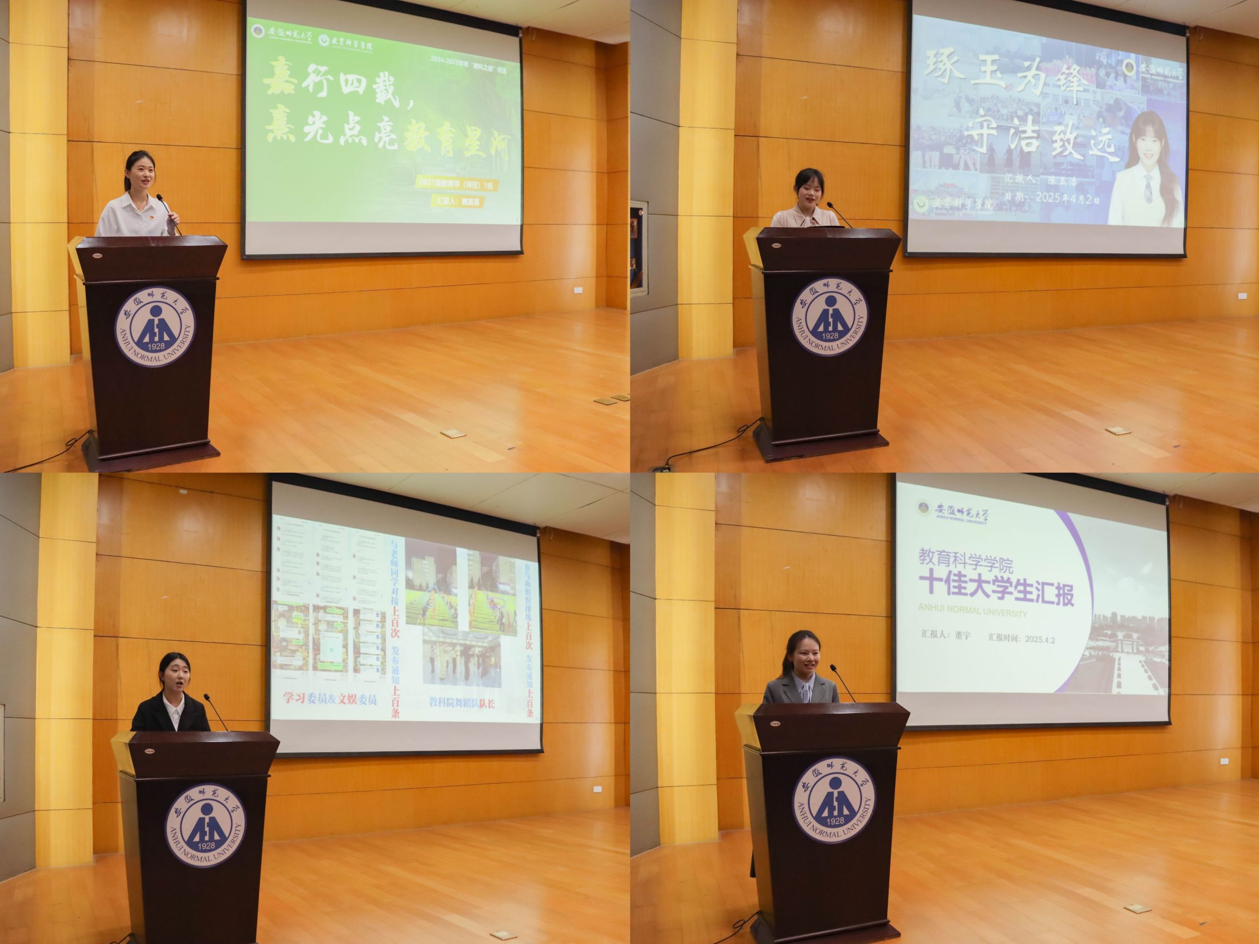 经过自主报名,班级推荐,学院审核等环节,共23位候选人参与现场汇报答辩。候选人通过PPT展示,围绕“科技创新与自主创业”“道德示范与自强奋斗”“社会实践与志愿服务”“学风创优与生态保护”“文艺创作与体育锻炼”五个类别,结合学术学习、思想引领、学科竞赛、社会实践等经历与成果进行汇报,展现了师大优秀教科人“追求卓越,全面发展”的精神风貌和杰出风采。
