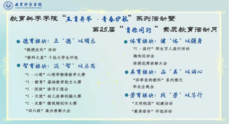 在学院的精心谋划下,本次素质教育活动将从“立‘德’以明志、汲‘智’以启思、健‘体’以强身、品‘美’以润心、践‘劳’以笃行”这五大维度依次推进。