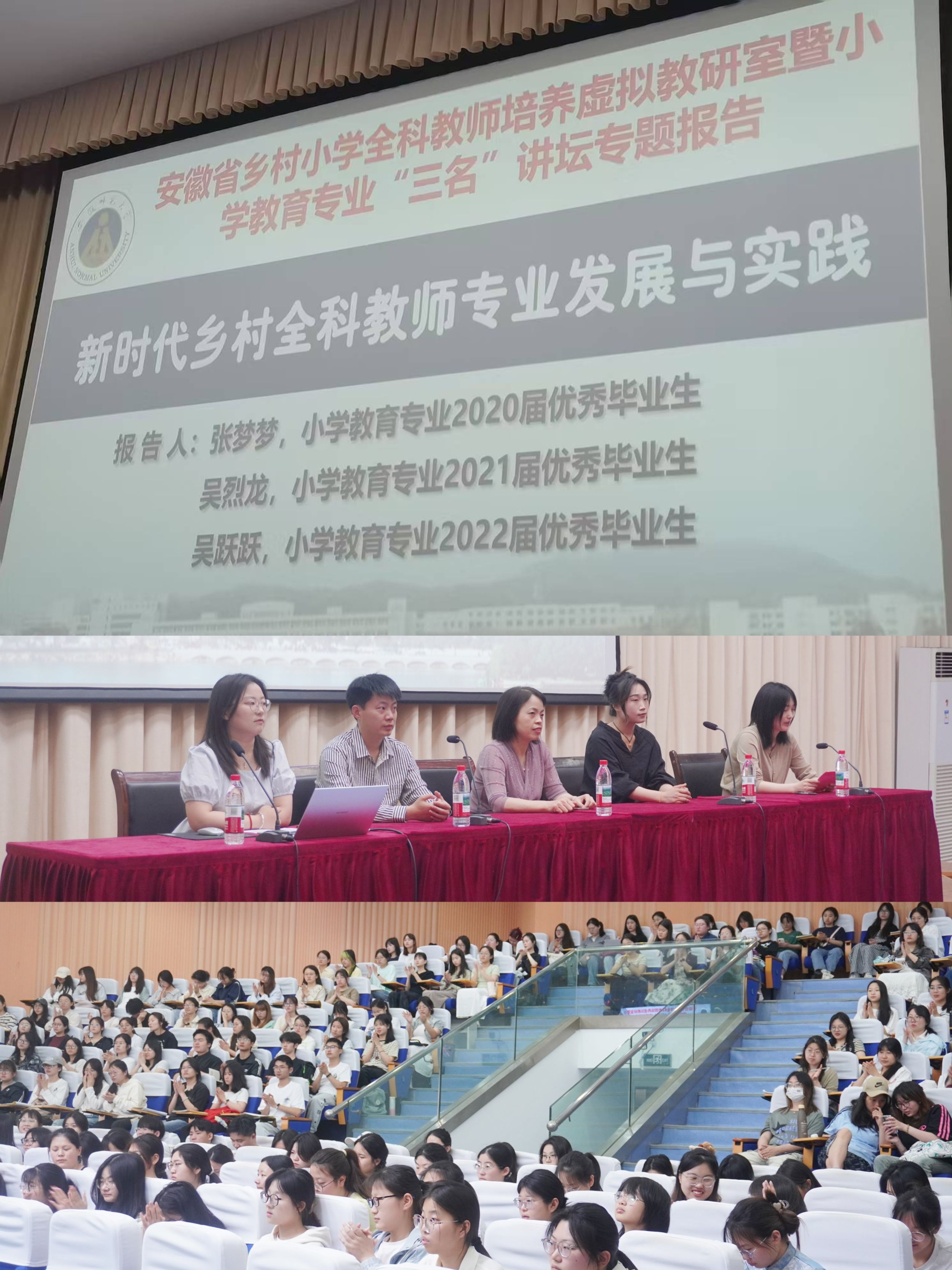 2025年4月19日上午8点30分,由安徽省乡村小学全科教师培养虚拟教研室主办的主题为“新时代乡村全科教师专业发展与实践”小学教育专业“三名”讲坛专题报告在安徽师范大学赭山校区科技礼堂隆重举行。本次活动特邀安徽师范大学小学教育专业(全科型)三位优秀毕业生——2020届张梦梦、2021届吴烈龙、2022届吴跃跃作为主讲嘉宾,分享他们的成长经历与教育实践智慧。小学教育(全科型)专业负责人王芳老师,专业秘书马兴老师及各年级本科生代表共同参与了此次活动。
