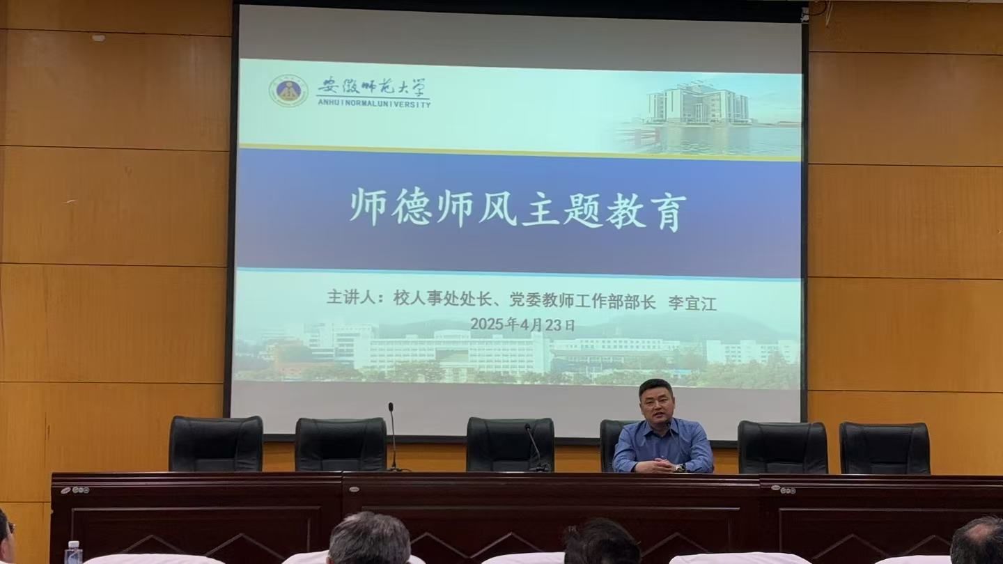 许国飞传达学习习近平总书记关于教师工作的重要论述及相关政策、梁言顺在全省教育大会上的讲话精神、《安徽师范大学师德师风行为处理实施细则(试行)》等文件精神,最后结合近期典型案例提出,要深刻理解师德师风建设的价值意蕴,要警惕失范边界模糊化趋势,要秉承教师初心使命,继承和发扬学院一直以来的优良院风、教风、师风。
