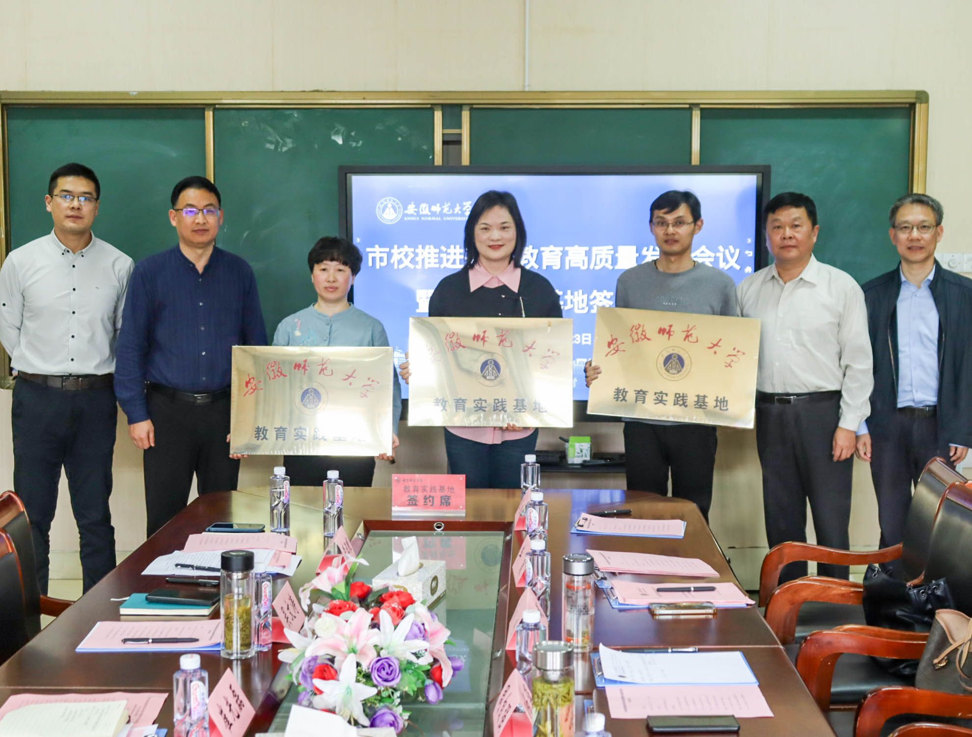 为贯彻落实基础教育振兴和大学生护航行动计划,促进人才培养工作,进一步提高育人质量,市校推进基础教育高质量发展会议暨教育实践基地签约仪式于4月23日在365英国上市官网408会议室成功举行。芜湖市教育局二级调研员周自强、安徽师范大学教务处处长崔光磊、教师教育学院院长宋波、365英国上市官网院长吴文涛、教务处副处长李汪根、365英国上市官网副院长韩建涛,以及芜湖市特殊教育学校、芜湖市镜湖幼儿园、芜湖市育红小学等7家学校负责人参加本次会议,会议由教务处副处长李汪根主持。