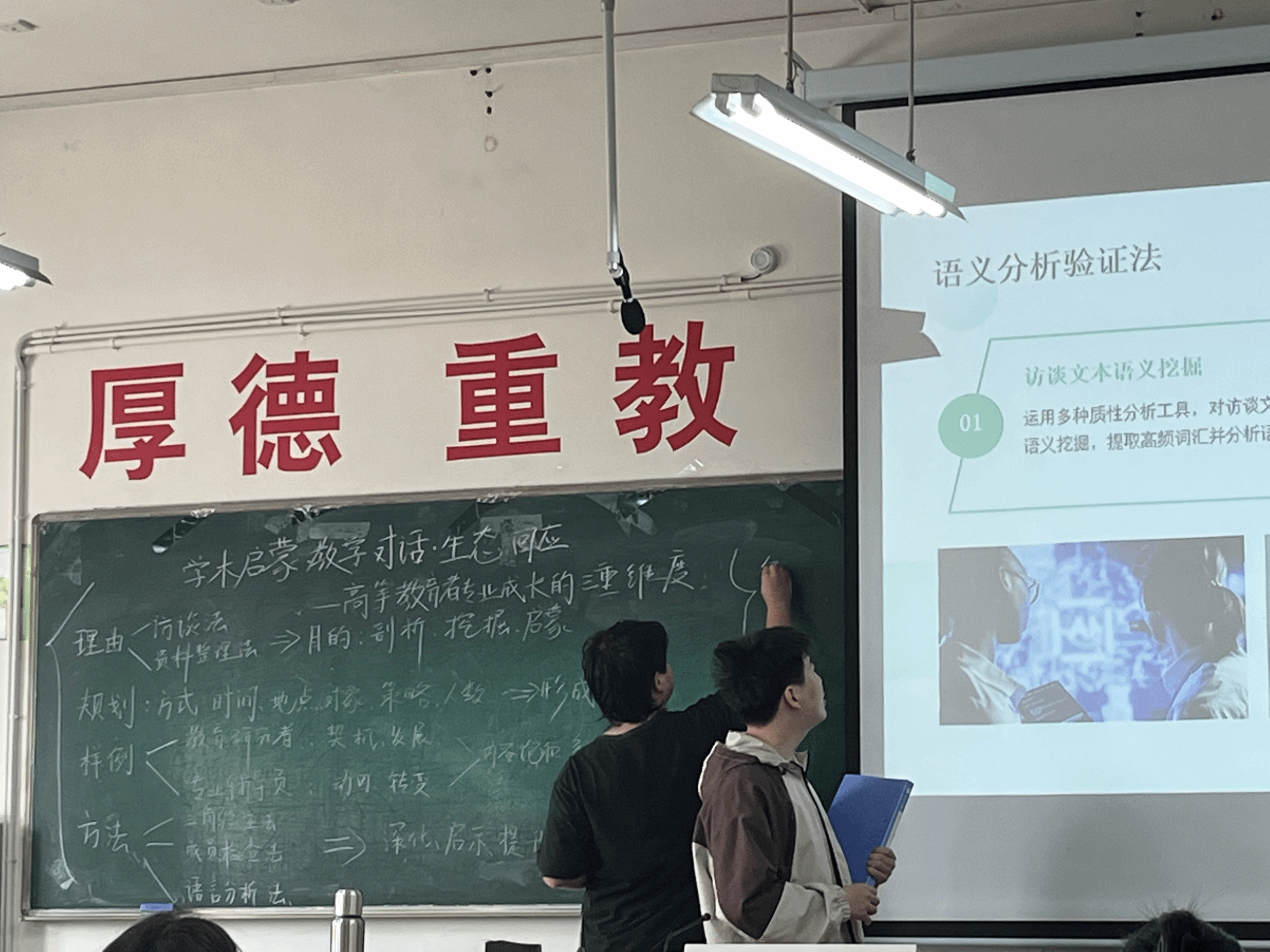本次课程采用学生主导、教师点评的研讨式教学,展示了为期1个月的质性实践研究成果。第一组成员对《学术启蒙•对话•生态回应—高等教育者专业成长的三重维度》进行汇报。小组成员深入分析了专业求学者、职业辅导员、高校专业教师等不同高等教育者的专业成长路径。从选题确定、访谈设计到资料分析与研究结果,学生们进行了全面呈现。在互动环节中,同学们就"高等教育者"和"学术启蒙"等关键概念展开讨论。徐红教授对选题科学性、题目表述及抽样方法等方面给予了专业指导与回应。