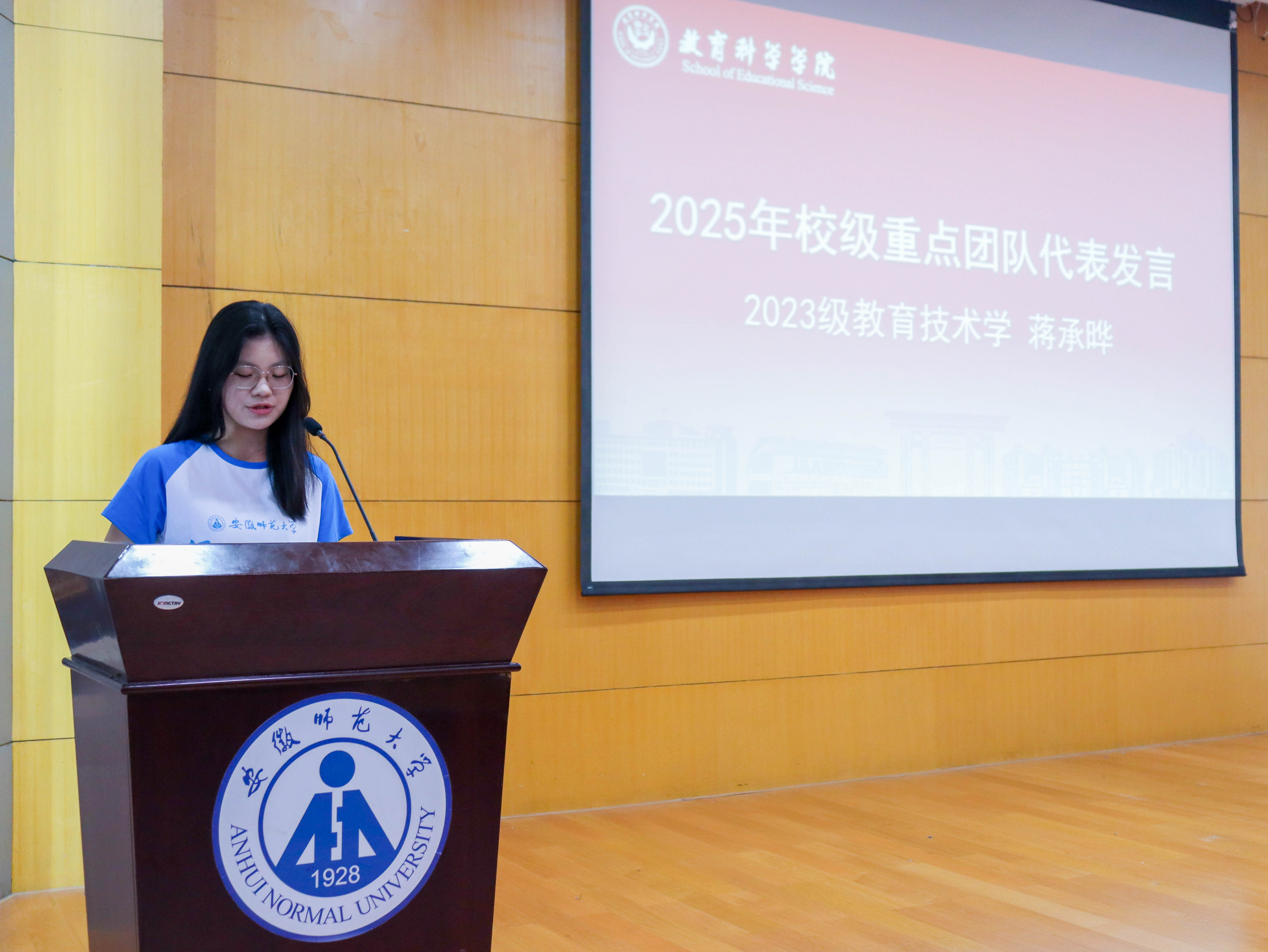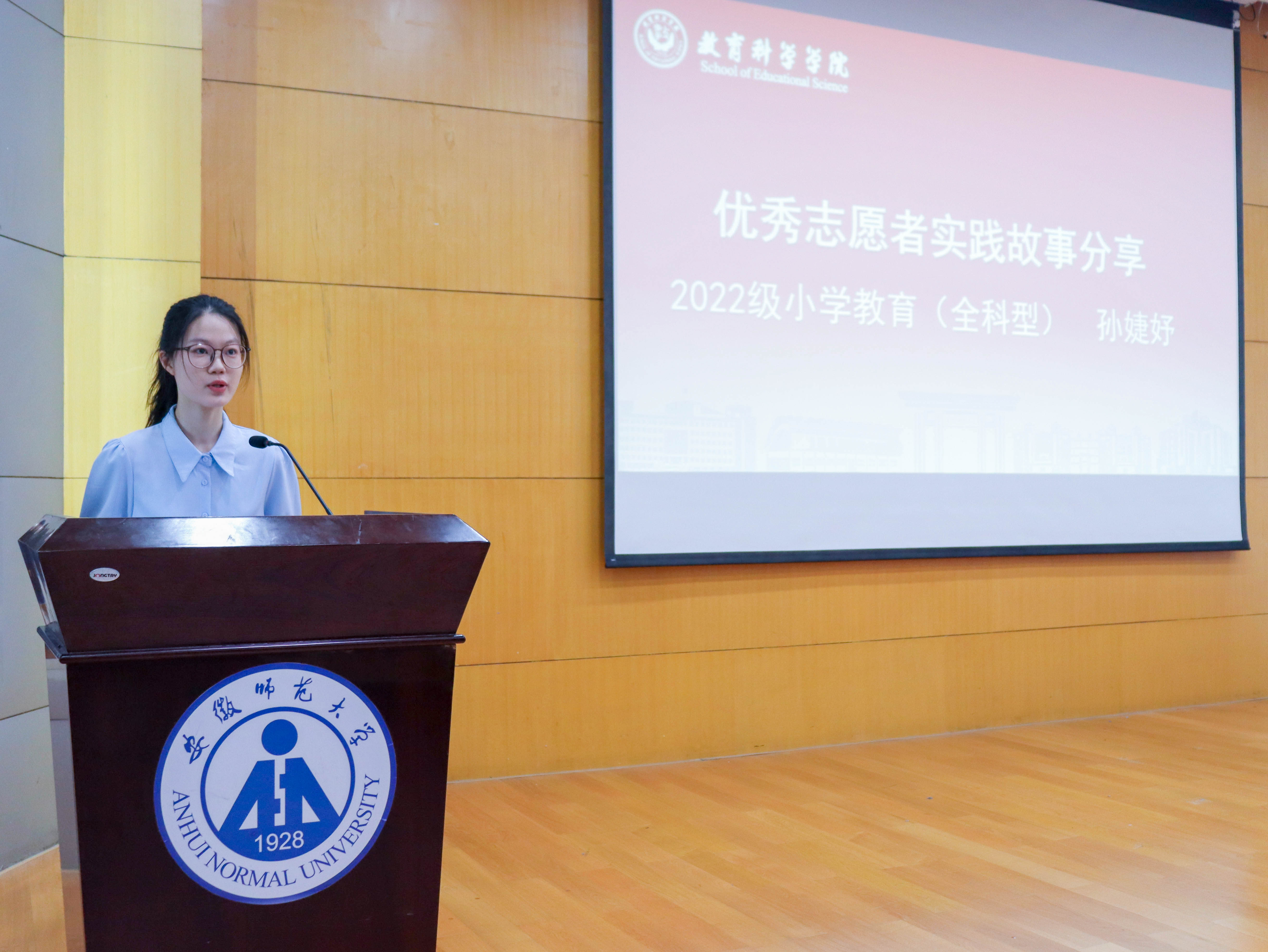 2022级小学教育(全科型)专业孙婕妤作为优秀志愿者代表,讲述了去年在芜湖特校与智力障碍青少年开展融合教育的经历,团队通过普通话推广、特奥旱地冰壶比赛等活动,助力特殊儿童成长,形成国家级媒体报道13篇,用行动诠释“普特融合”的教育温度。2023级教育技术学专业蒋承晔作为校级重点团队代表发言,回顾24年赴马鞍山和县支教时光,一件件温馨的故事仍历历在目,在今年的暑期社会实践过程中,团队将继续保持初心、砥砺前行,在乡村教育服务中践行“学思并重、知行合一”的院训。
