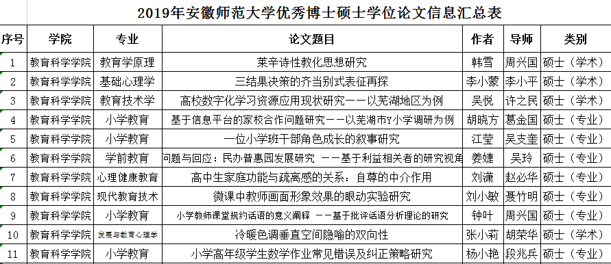 (教科院 叶方舟 周晴)经学位点提名、学院参考《优秀学位论文通讯评议指标体系》与学校文件进行推选和公示、研究生院审查等多个环节,在我校2019年优秀硕士学位论文的评选中,我院教育学方向韩雪等11名同学的论文成功入选。
