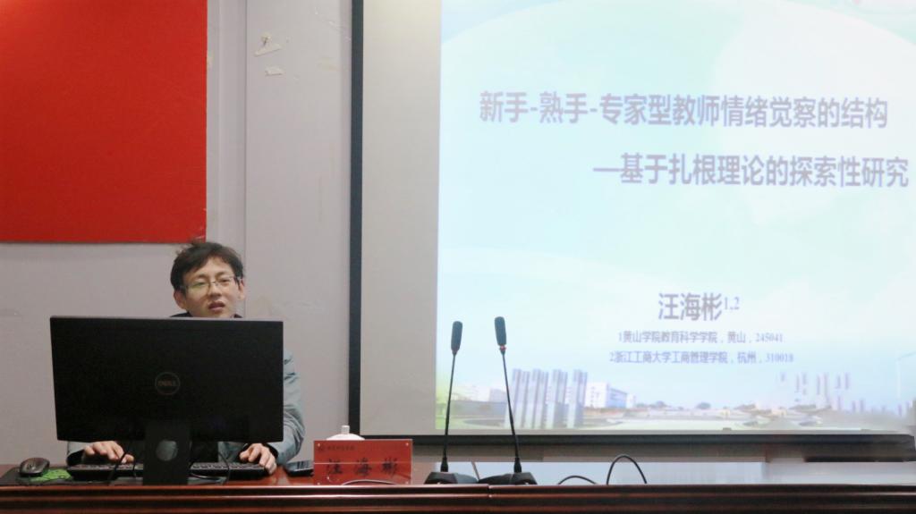 (本网讯 文/姜惠玲 图/夏彩虹)12月28日上午,黄山学院汪海彬副教授做客我院皖江心理大讲坛,进行了“新手-熟手-专家型教师情绪觉察的结构——基于扎根理论的探索”主题讲座。本次讲座于365英国上市官网313学术交流中心进行,由心理健康教育专业学位硕士点负责人、硕士生导师全莉娟副教授主持,心理学专业部分教师与研究生到场学习。