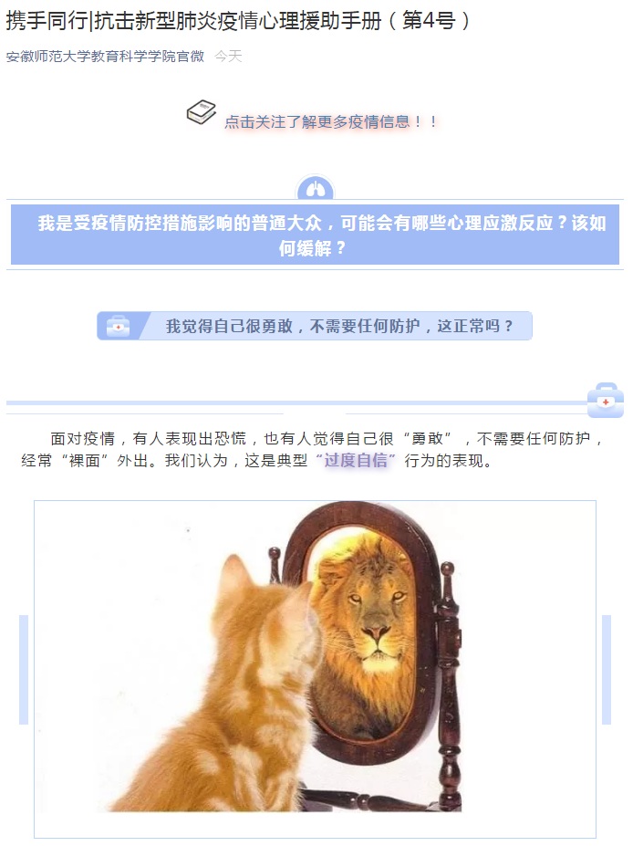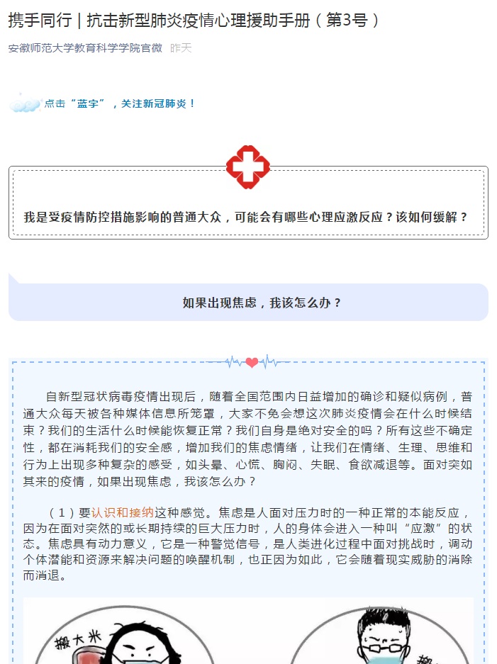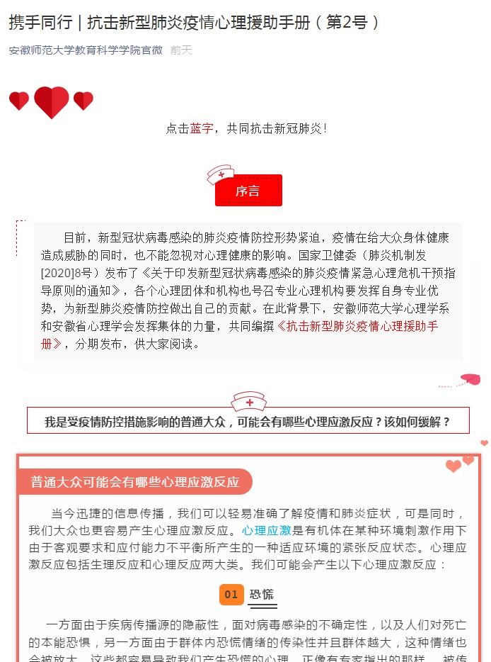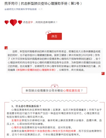 桑青松院长组织学院心理学系和安徽省心理学会的心理学专家,联合编制了《抗击新型肺炎疫情的心理援助手册》,并分期发布,为疫情防控一线医护人员或工作人员,居家隔离的密切接触者或疑似患者,疫情防控的组织管理人员或志愿者,受疫情防控措施影响的普通大众等不同人群心理应激反应的自我调适提供专业指导。目前《抗击新型肺炎疫情的心理援助手册》已经完成(见附件),并已经通过学院公众号发布4期(第1-4号),最后4期将陆续发布,心理援助手册将为普通大众、学校师生提供心理自我调适的专业支持。