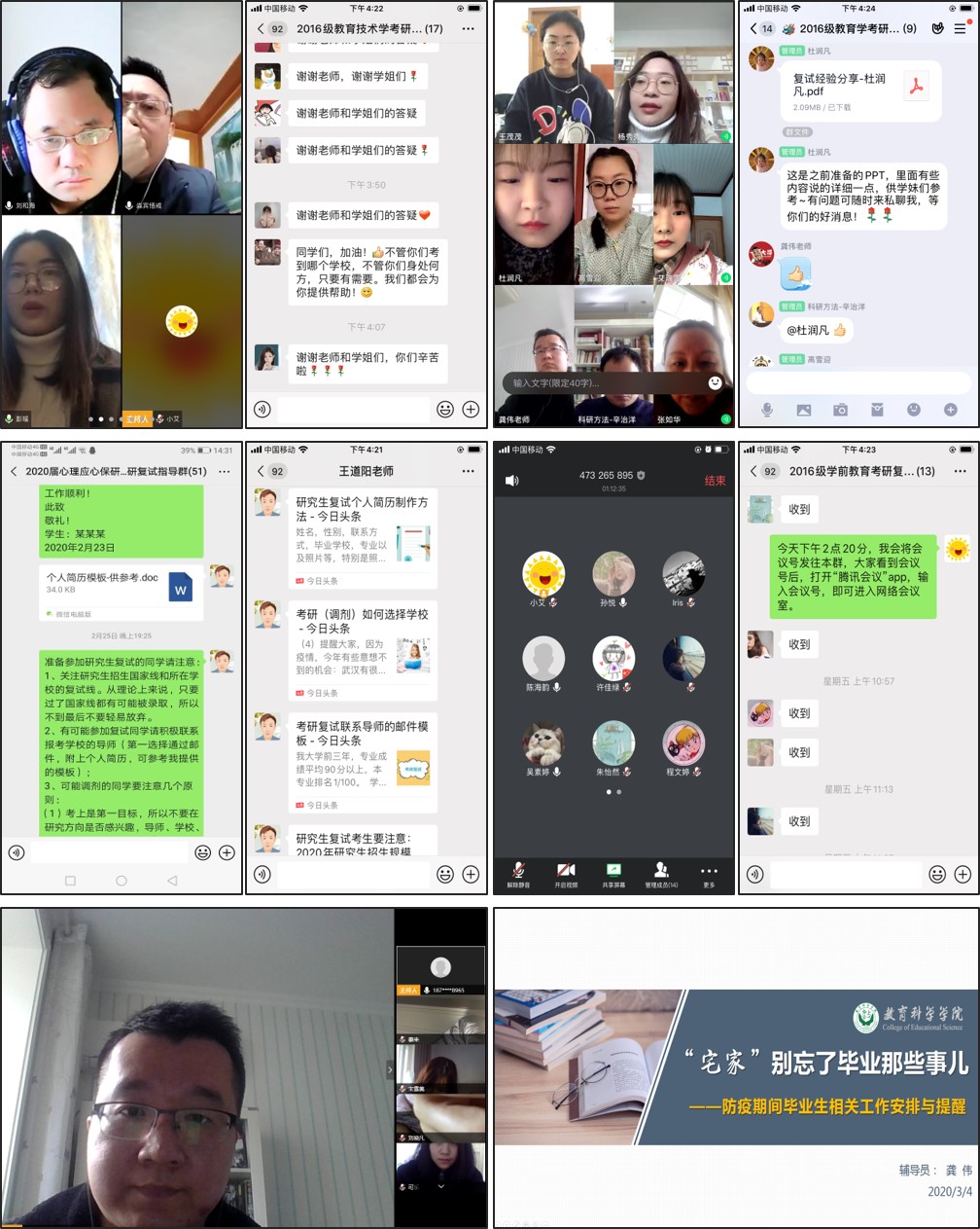 研究生考试初试成绩公布后,教科院对考研毕业生初试成绩进行了统计,宣传研究生扩招政策,动员教师、辅导员对准备研究生复试、调剂的毕业生进行精准辅导,倾心服务,并鼓励其他同学积极就业。这段时间以来,各专业负责人结合新的研招形势和变化进一步细化辅导内容,强化面试环节的应答和知识梳理,同时就调剂院校的甄别和选择进行针对性指导。尽管无法直接面谈,但学院通过“QQ视频”“腾讯会议”,以另一种独特的“面对面”方式为毕业生送去了贴心服务。除此之外,教科院“本科生导师制”发挥了关键作用,每一名面临复试或调剂的毕业生除了得到来自学院的集中式指导之外,还接受了专业导师一对一帮扶。与此同时,毕业班辅导员通过视频会议及时落实毕业班日常管理工作,坚持“四早四勤四抓”,即早规划、早布置、早行动、早落实;勤查看、勤汇报、勤记录、勤提醒;抓纪律、抓重点、抓节奏、抓效果,并实施“每日指导”,利用专门的线上交流平台在简历诊断、面试技巧、考公难点、考编重点等方面及时提供优质资源。