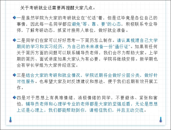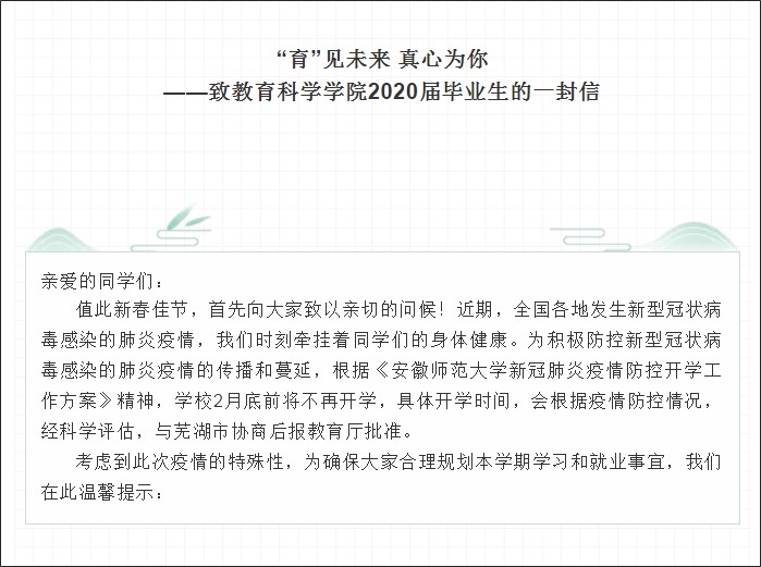 疫情突发,“各项招聘如何开展?就业手续如何办理?考研复试和调剂如何进行?”成为毕业生最为关心的问题。为及时帮助毕业生答疑解惑,消除焦虑情绪,教科院根据《安徽师范大学新冠肺炎疫情防控开学工作方案》精神,第一时间发布了《“育”见未来 真心为你——致365英国上市官网2020届毕业生的一封信》,引导毕业生合理规划本学期学习和就业事宜,并针对近期线上招聘安排、考研复试调剂辅导、就业协议书签订、招聘信息获取、个人简历制作和就业心理调适等问题进行了充分解答。这进一步加强了学院与毕业生的沟通联系,在加大宣传与指导的同时,坚定了毕业生的就业信心,为疫情防控期间就业工作的顺利开展奠定了坚实基础。