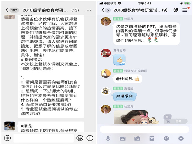 五个专业的考研复试网络辅导会分批次进行,以答疑解惑、引导规划为重心。教科院党委副书记张如华全程参与五个专业的考研复试网络辅导会。会上,她对考研录取流程及注意事项进行解析,并叮嘱同学们密切关注、及时了解国家线、相关院校资讯、切实做好复试或调剂准备。教科院教学副院长辛治洋在教育学专业的网络辅导会中首先对参加复试指导的优秀毕业生们表示感谢,他提醒同学们在复试过程中要“真实”、“诚信”、“有底气”。他强调同学们在面试过程中要有良好的心理状态,要有抗压能力。学前教育专业负责人王路曦老师在学前教育专业网络辅导会中就信息获取、复试技巧、导师联系等方面的问题进行详细解答、提出建议。教育技术学专业负责人杨滨老师在教育技术学专业网络辅导会中希望同学们对于复试过程中的专业问题要有自己的理解,不能照本宣科、死记硬背;对于自己的毕业论文要如数家珍、思路清晰、逻辑严谨、理论清楚。教育技术学专业刘和海老师提醒同学们在准备复试期间可以读一到两本教育名著,面试中要有礼貌、张弛有度,有逻辑、层次分明,要有专业自信。教育学专业负责人徐赟老师和心理学专业负责人王道阳老师专门撰写了系列考研辅导短文供学生参考,通过微信、扣扣等网络平台统一指导,并分组安排教师进行个别指导。2016级辅导员龚伟老师在教育学专业网络辅导会中就面试技巧、语言表达等方面对同学们进行指导。