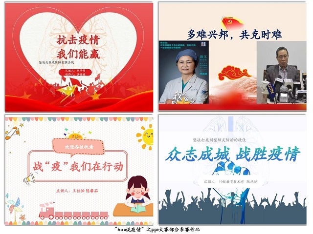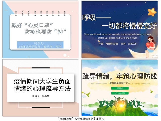 4月11日,学院举办了第二十届“育你同行”素质教育活动月暨“hua”说疫情主题比赛。截至目前,累计收取作品100余份,参与人次近400人。各专业学子充分发挥自身特色,灵活运用所学知识技能:学前教育专业同学创作有声绘本向学前儿童宣传疫情故事;心理学专业同学通过制作心理微课针对疫情期间的负面情绪提出有效心理疏导方法,传播正能量;教育技术学专业同学则以ppt汇报、录播的方式介绍疫情各方面的知识信息。据悉,学院接下来将选择优秀作品进行线上宣传,并将一些打磨完善的作品发送给部分幼儿园和中小学校,进一步扩大作品影响力。