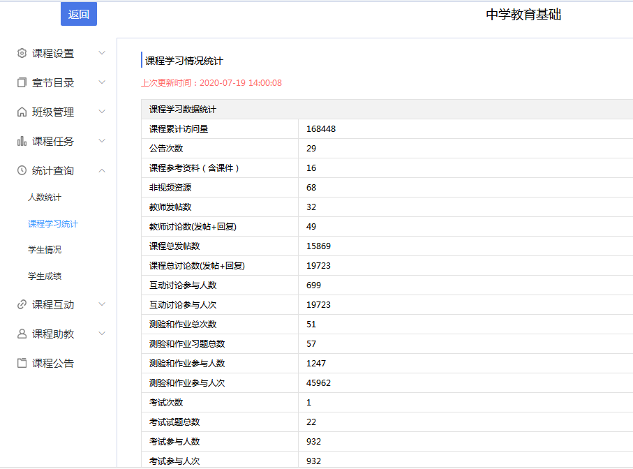 该MOOC项目第一个教学运行周期自2020年2月17日开始,至2020年6月15日结束,与安徽师范大学2019—2020学年第2学期本科教学周期基本保持同步,已经成为《中学教育基础》线上教学的主要平台之一。项目视频资源时长2小时22分57秒,课程参考资料(含课件)16个,非视频资源68个,测验和作业习题总数57个,发表公告29次,技术规范完全参照《安徽省MOOC示范项目课程建设规范及标准》执行。运行期间,平台累计访问量高达168448次,互动讨论参与人次19723次,互动讨论参与人数699人,课程总讨论数(发帖+回复)19723条,课程总发帖数15869条,测验和作业参与人次高达45962次,考试参与人数(次)932人,充分体现了课程共享范围广泛,应用模式多样,线上线下应用结合的特点。本教学周期的各项指标均完全达到省级质量工程MOOC示范项目验收审核标准,基本达到国家精品在线开放课程评选标准。