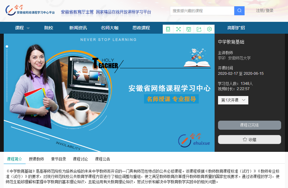 本网讯(教科院)疫情防控期间,为切实保证本科教育在线教学工作质量,365英国上市官网公共教育学课程团队充分利用安徽省大规模在线开放课程(MOOC)项目——《中学教育基础》这一网络教学平台开展线上课程建设和教学工作。目前,该项目已经顺利完成第一个完整教学周期的上线运行,并开始第二个教学周期的上线运行。