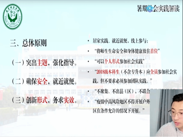 程啸老师根据文件要求,向同学们重点解读了本次暑期社会实践的相关内容,包括“青年大学习”行动、“共筑青春堤坝”防汛救灾志愿服务、“绽放战疫青春”助力疫情防控和复工复产、投身脱贫攻坚和乡村振兴、“云课堂”教育帮扶、“云调研”走访采风和“返家乡”实践锻炼等七个方面。他立足于学院教育学和心理学专业,对同学们的实践内容提出要求,希望学生们紧紧围绕自身专业,充分发挥师范类专业特点和优势,依托学院过往的社会实践基地以及“全心全‘益’”的支教品牌项目组建云团队,通过云端方式开展一对一的课业辅导、心理疏导、知识宣讲等教育精准帮扶活动。针对今年暑期社会实践启动较晚,且疫情防控仍处于较为紧张阶段的现状,程啸老师鼓励选择个人实践的同学可以重点开展“云调研”活动和“返家乡”实践锻炼。在注意安全的前提下,有条件的同学可以投身防汛救灾的志愿服务工作,把青春献给祖国和人民最需要的地方。