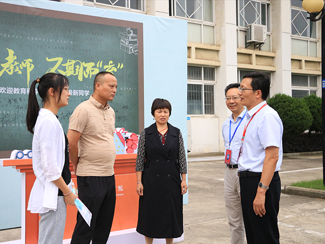 在新生报到当天,校领导、院领导多次前来与值班师生沟通交流,时刻关注新生报名进程,了解迎新情况。校长张庆亮在院领导的陪同下视察迎新工作开展情况,肯定了教科院2020级新生均为师范生这一学院特色,并对学院强调学思并重、知行合一的教学思想表示了高度赞赏。院党委书记方泓、院长李宜江等学院领导在报到期间多次向值班老师了解迎新工作进度并给出指导意见。此期间,校院领导多次与新生和家长沟通交流,不仅主动了解学生的基本情况,还为学生及家长介绍了学校及学院的情况与特色,就学生在专业上的疑惑以及对未来的迷茫进行了专业性的解答。