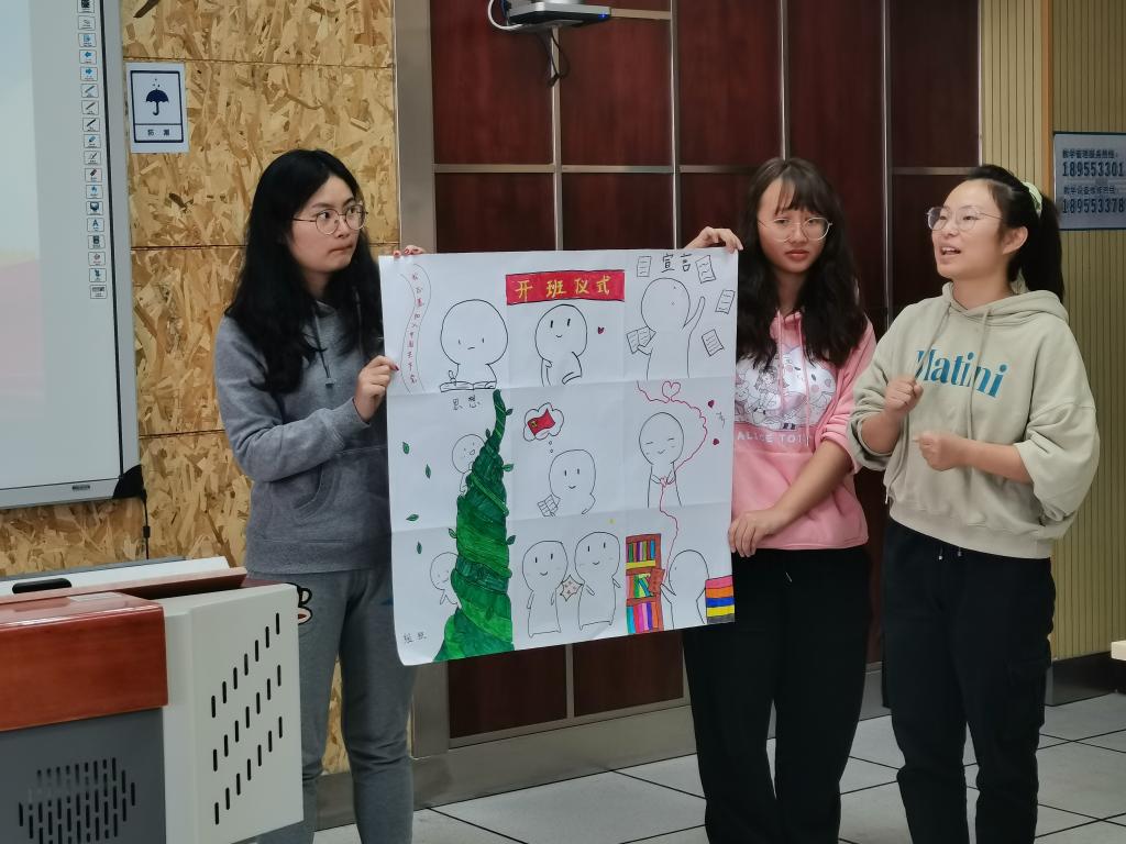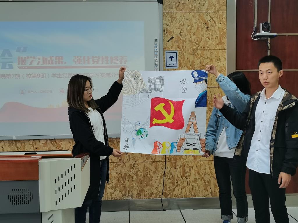 绘画结束后,每组成员代表带着本组的作品在全班进行了分享和展示。第一小组成员以党课班的四次理论学习为切入点进行构思,红色经典中汲取精华,忆古思今中传承红色基因,不断提升自我,发挥先锋模范作用,并承诺必将不忘初心,牢记使命,继续前行。