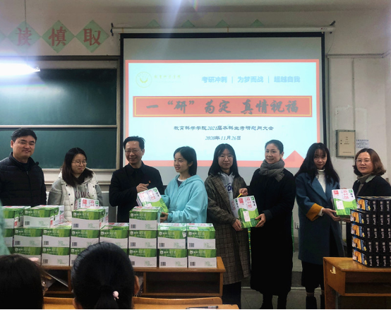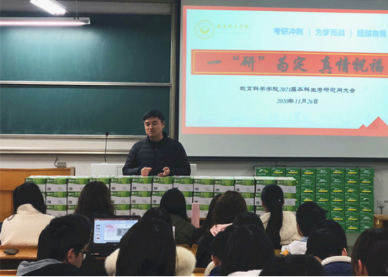 本网讯(教科院 张旖馨)距离2021年全国硕士研究生招生初试考试还有一个月的时间,对于考研学子们来说,这段时间是最后的冲刺阶段。为给他们加油鼓劲,送去祝福,2020年11月26日上午,学院在田楼8103教室召开了2021届毕业生考研慰问大会。学院党委书记方泓、院长李宜江、党委副书记张如华、行政副院长何海燕、毕业班辅导员谭茹轩,以及2021届100多位考研学子共同参加了此次活动。