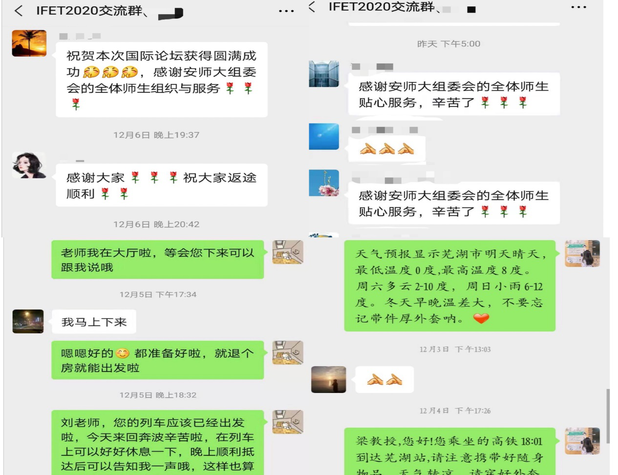 本网讯(文/邸滢瑞 谢伟燕 图/李琴)2020年12月5-6日,由安徽师范大学教科院承办的“第十九届教育技术国际论坛(IFET2020)”在芜湖海螺国际大酒店成功举行;学院领导牵头的11个筹备小组共150余名师生,积极开展了为期近2个月不间断的会务筹备和服务工作。会议期间,各项服务保障工作井然有序、运转高效。会议成功承办,不仅给全国乃至世界多国的专家学者留下了高端化、国际化、特色化的好印象,与会人员还对会务精准周到、温暖有情的服务纷纷点赞。