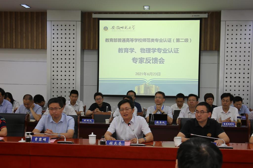 张志东代表省教育厅感谢教育部认证专家对安徽师大发展建设的指导和帮助,对安徽高等教育事业的关心和支持。他要求学校要以专业认证为契机,尽快落实整改任务;以专业认证为抓手,提升专业建设质量;以专业认证为起点,全面推进高水平大学建设。