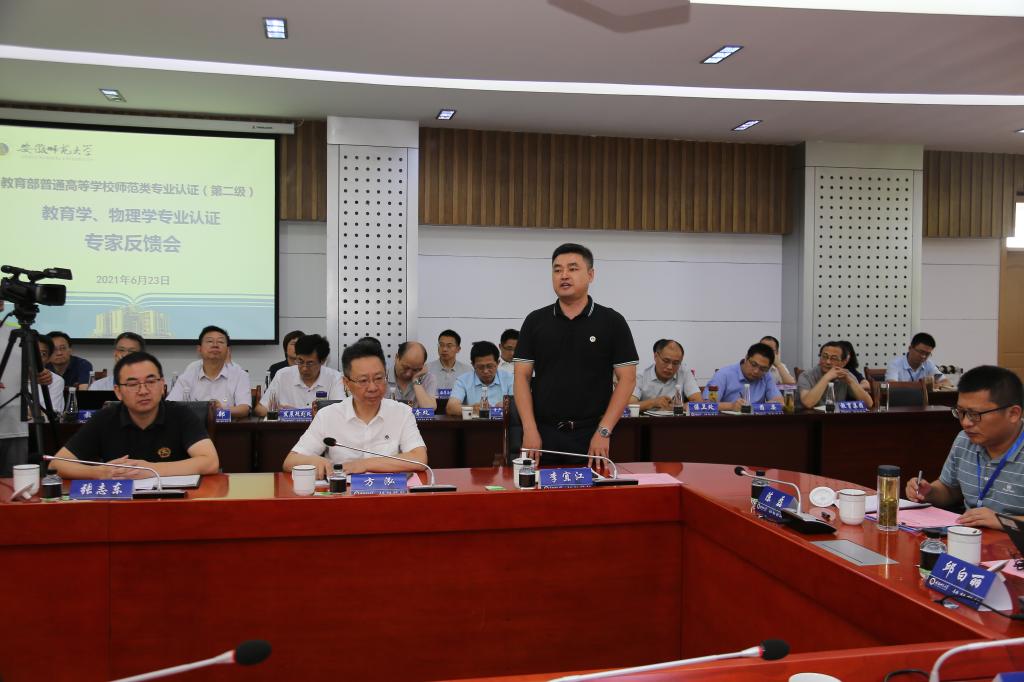 张志东副主任介绍专家组成员,并对本次认证工作的目的、任务和要求做了简要说明。胡朝荣书记对专家组来校表示欢迎和感谢,他简要介绍了学校办学历史和发展定位,胡朝荣强调了我校作为安徽省建校最早的高等学府,93年来学校始终坚持教师教育办学特色,不忘初心,牢记师范大学责任与使命,为国家和社会培养大批人才,尤其是为安徽省培养了一大批中小学校长和名师。他指出学校将以此次认证工作为起点,积极配合,全力做好此次认证工作,不断提升师范专业建设水平,着力培养卓越教师和未来教育家。