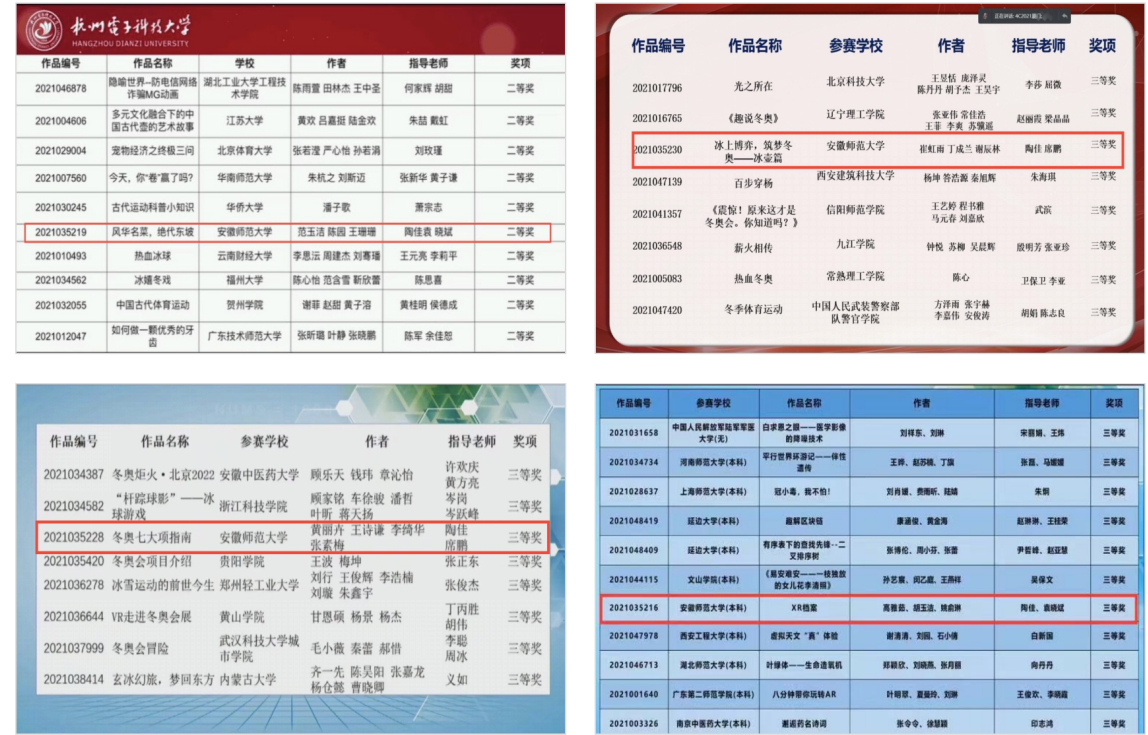 中国大学生计算机设计大赛是由教育部倡导的大学生学科竞赛之一,大赛由教育部高等学校计算机科学与技术教学指导委员会、软件工程专业教学指导委员会、大学计算机基础课程教学指导委员会等单位联合主办。大赛始创于2008年,迄今已有14年的办赛历史,覆盖全国近半数以上本科院校,是全国高校学科竞赛排行榜中规模最大、认可度最高的国家级计算机设计赛事。本届大赛决赛共有来自北京大学、同济大学、华中科技大学、华东师范大学等766余所高校的7200人次参加。在指导教师的精心组织和全程指导下,18教育技术学专业入围国赛的作品首次覆盖了微课与教学辅助、信息可视化、数媒游戏与交互设计、数媒动漫与短片4个类别,和1624个作品同场竞技,其中,《风华名菜,绝代东坡》(陶佳、袁晓斌指导)获国家二等奖,《冰上博弈,筑梦冬奥——冰壶篇》(陶佳、席鹏指导)、《东奥七大项指南》(陶佳、席鹏指导)、《XR档案》(陶佳、袁晓斌指导)获国家三等奖。