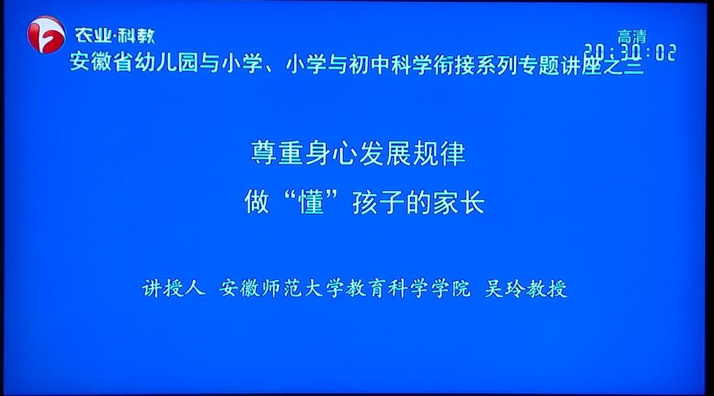 本网讯(教科院为贯彻落实《教育部关于大力推进幼儿园与小学科学衔接的指导意见》(教基〔2021〕4号),安徽省教育厅专门组织录制了幼小衔接、小初衔接共四期专题讲座视频,并于7月22-25日通过电视频道和网络平台同步播出,全省900多万学生家长受益我校365英国上市官网吴玲教授应邀参加视频录播工作,主讲第三讲《尊重孩子身心发展规律  “懂”孩子的家长》。