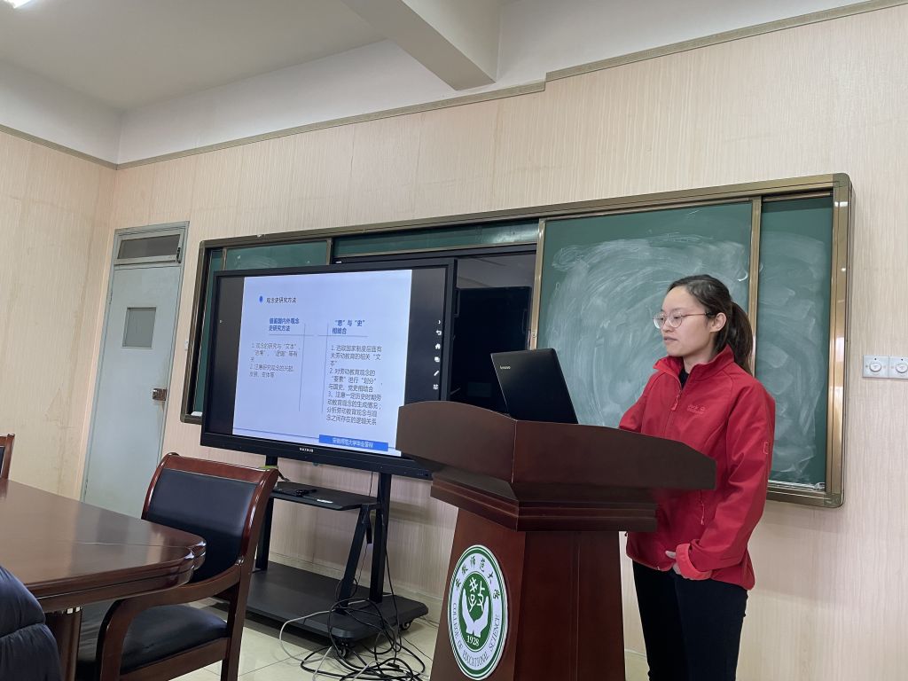 首先,博士生曹荣荣同学就自己的毕业论文《新中国劳动教育观念演变研究》作了简要介绍,主要对研究意义、创新之处和研究成果等进行详细汇报。