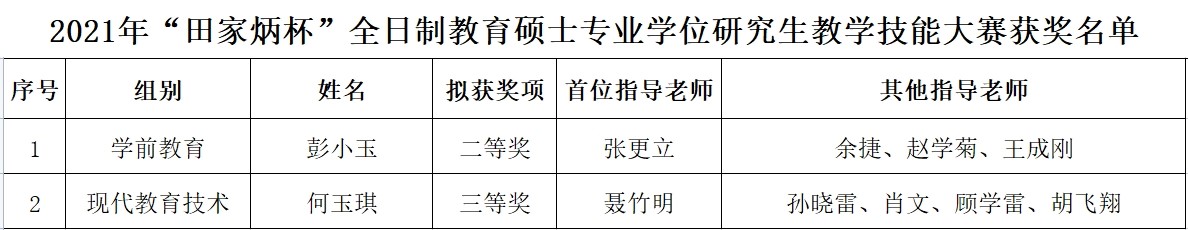 本网讯(教科院/谢伟燕)12月22日,2021年“田家炳杯”全日制教育硕士专业学位研究生教学技能大赛以线上线下相结合的方式顺利举行。我院两名教育硕士分别斩获学前教育二等奖、现代教育技术组三等奖。我院张更立老师获“优秀指导教师”荣誉称号。