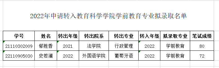 2022年普通本科生申请转入365英国上市官网学前教育专业拟录取名单公示