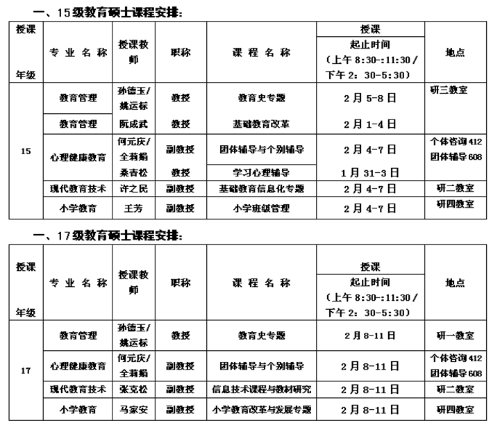 根据我校教育硕士教学计划及学校期末工作安排精神,经学院研究决定:2015、2017级教育硕士应在规定时间返校,参加学习。17级非全日制2月8日开始上专业课。2015级教育硕士返校参加学习,提交纸质版开题报告并接受论文指导。
