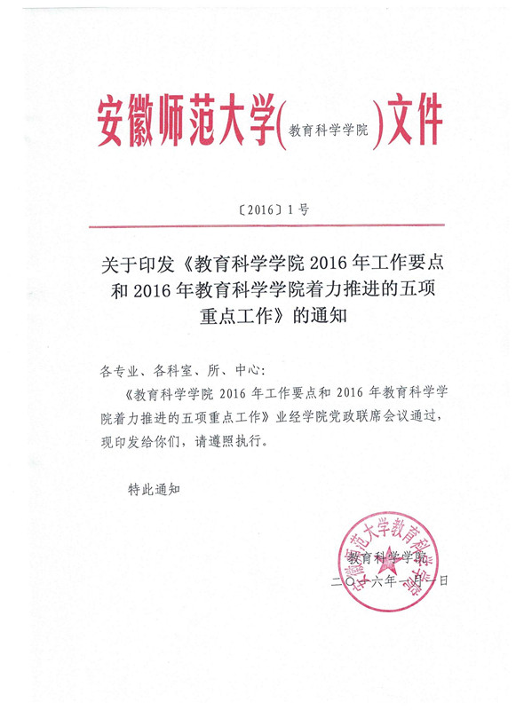 关于印发学院2016年工作要点和着力推进的五项重点工作