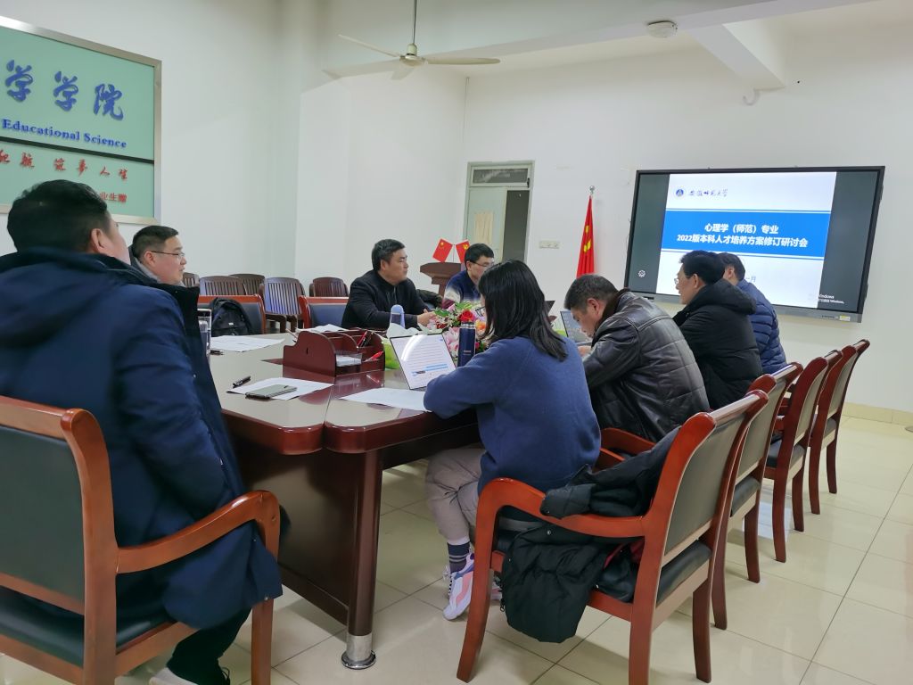 本网讯(教科院 刘田田)2022年1月26日下午,学院在308会议室召开了心理学(师范)专业2022版本科人才培养方案修订工作研讨会。院长李宜江教授、心理学系葛明贵、桑青松、赵必华、宣宾、方双虎、李小平、刘田田等老师参加了此次会议,会议由心理学专业负责人韩建涛副教授主持。