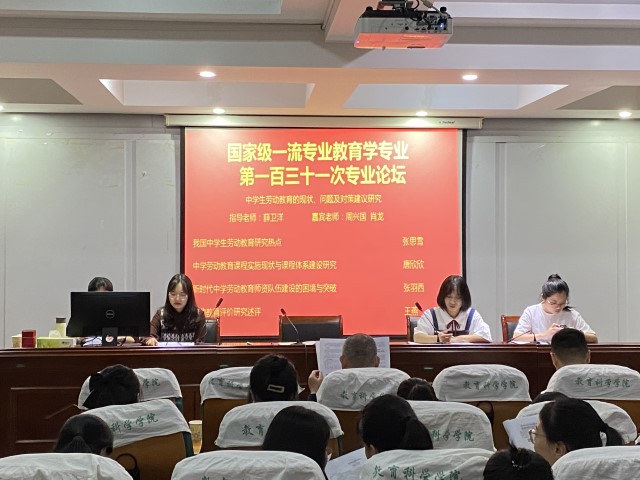 本次专业论坛王燕小组以“中学生劳动教育的现状、问题及对策建议研究”为主题展开探讨。第一位汇报人张思雪以《我国中学生劳动教育研究热点——基于CiteSpace知识图谱的可视化分析》为题,通过关键词共现和关键词聚类分析等功能来分析我国中学生劳动教育的研究热点。第二位汇报人唐欣欣以《中学劳动教育课程实施现状和课程体系建构研究》为题,通过问卷法、访谈法调查中学劳动教育课程的实际开展情况,并结合相关政策文本及学者的研究初步搭建中学劳动教育课程的框架,以期为中学劳动教育课程体系的构建添砖加瓦。
