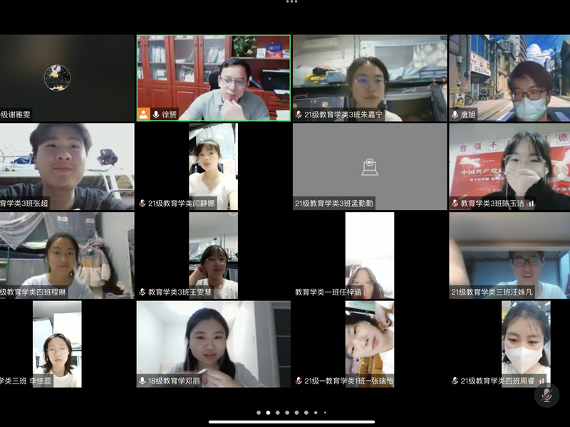 本网讯(教科院 文/图 谢雅雯)为进一步做好2021级教育学类的专业分流工作,加深同学们对教育学专业的理解,4月9日晚7点至9点,国家级一流本科专业建设点教育学专业以线上会议的形式,面向2021级教育学类全体本科生举办了教育学专业解读会。与前期专业人才培养方案解读暨宣讲答疑会不同,本次会议邀请了2021届教育学专业毕业生唐旭与2018级教育学专业本科生邓丽等两位同学,从学生视角为同学们解读专业。会议由教育学专业负责人徐赟老师主持。