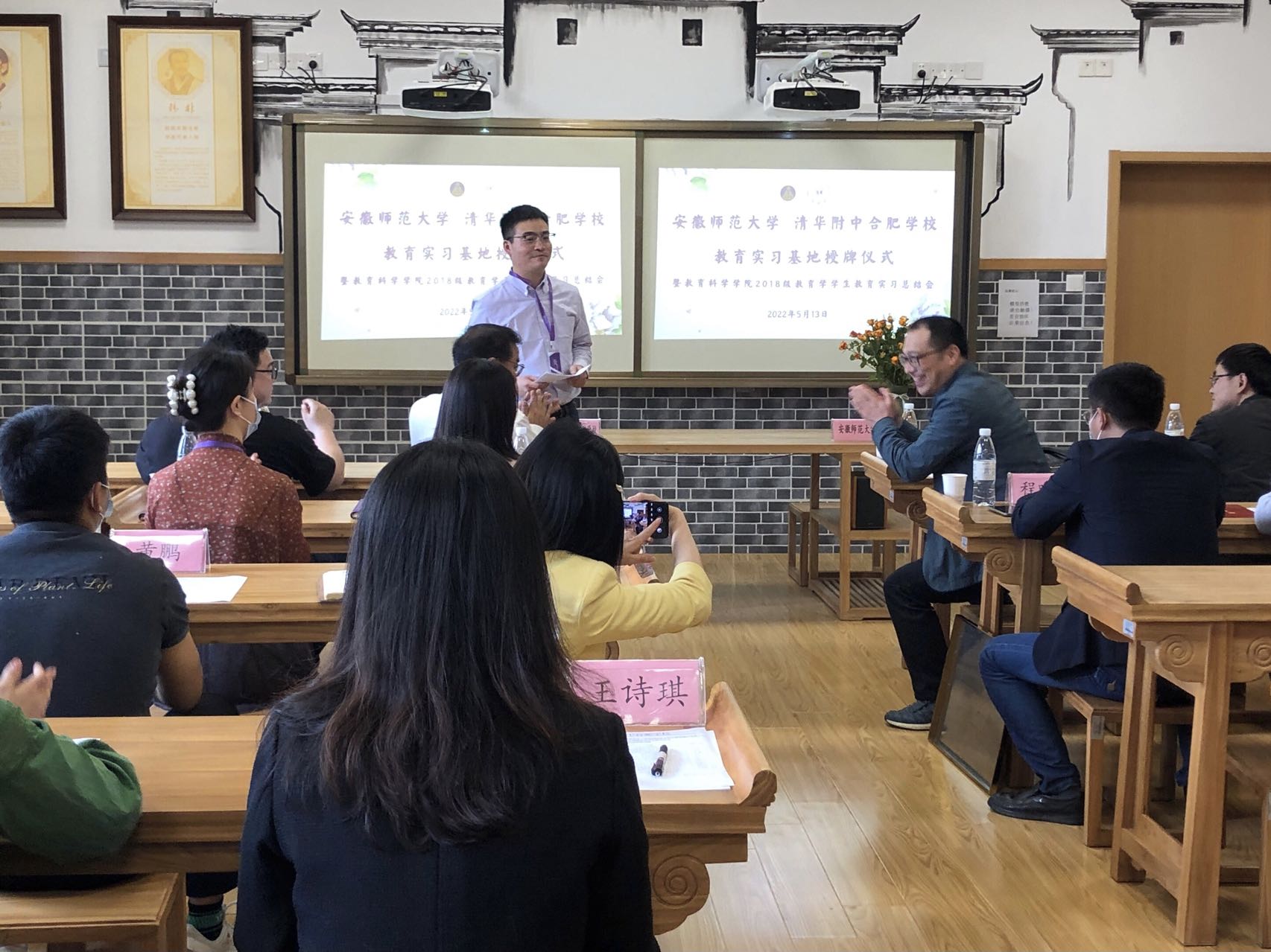 此次实习的圆满结束标志着我院与清华附中合肥学校首次合作的达成。在同学们热烈的掌声中,主持人丁向鸣拉开了签约仪式的序幕。安徽师范大学教务处副处长李汪根与清华附中合肥学校校长俞家新签署实习基地合作协议,并合影留念。在致辞中,校长俞家新对10位实习生提出未来要更努力学习、要热爱生活保持好奇心、要为学习与生活赋予意义三点要求,希望实习生们能在日后的学习、工作生涯中为教育事业贡献出自己的一份力量。随后,教务处副处长李汪根感谢清合对教育学专业教学和人才培养的支持,同时指出要将实习基地发展成集学生见习、实习、教育教学研究的平台。最后,教务处实践科科长程啸天为清华附中合肥学校授予“安徽师范大学教育实习基地”牌匾。