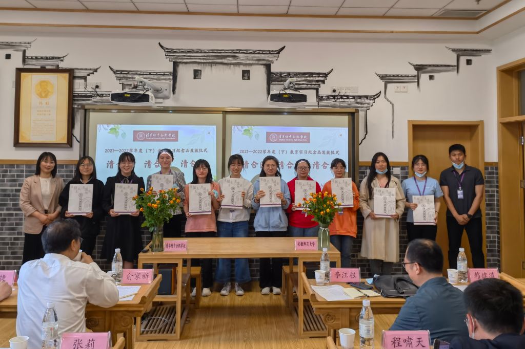 专业与实习基地结合日常表现,秉持着公平公正的原则,评选出李雅馨、邓丽两位同学为优秀实习生,并由小学部部长张莉颁发证书。教科院副院长韩建涛代表学院赠予实践导师“江淮名师成长之路”系列丛书,走进名著,助力清合教师的专业化成长。清华附中合肥学校也为10名实习生准备了纪念品,印有清合校徽的六彩本子、绘本《快乐的诗人李白》以及附有实践老师赠语的明信片等,承载着校园文化,也寄托着对我院实习生的殷切希望。