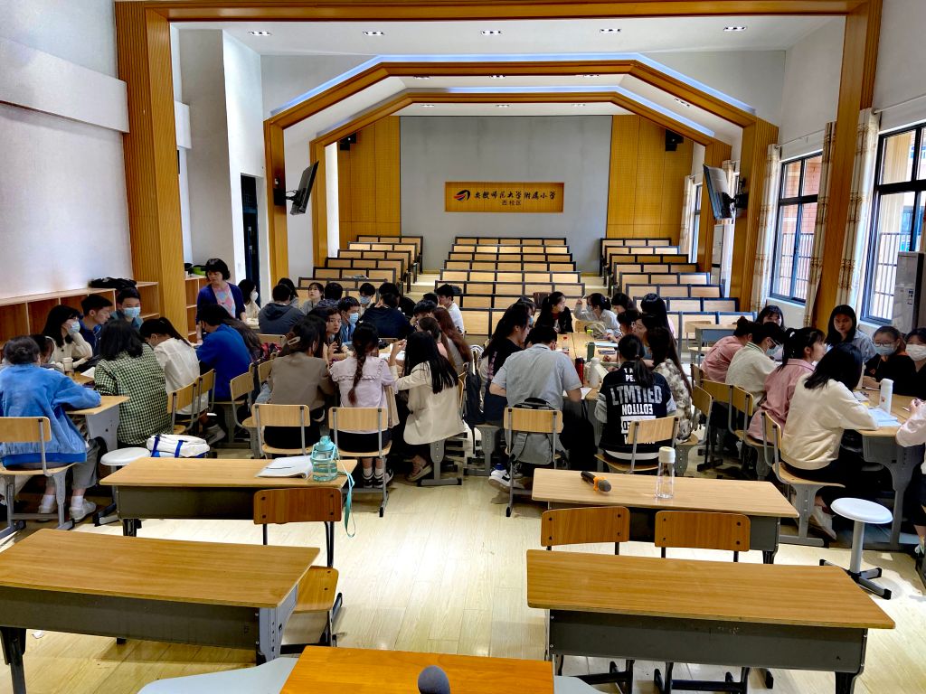 第四个环节是观摩课堂教学,了解和走进儿童。同学们以小组为单位到科学、美术、体育等学科课堂教学中进行现场观摩。期间,同学们观看体育老师组织小学生列队、整队、开展游戏等一系列教学活动,积极走近儿童,并与教师进行交流。同学们认真参与,积极交流,极大地促进了同学们对体育课堂教学活动组织的反思。
