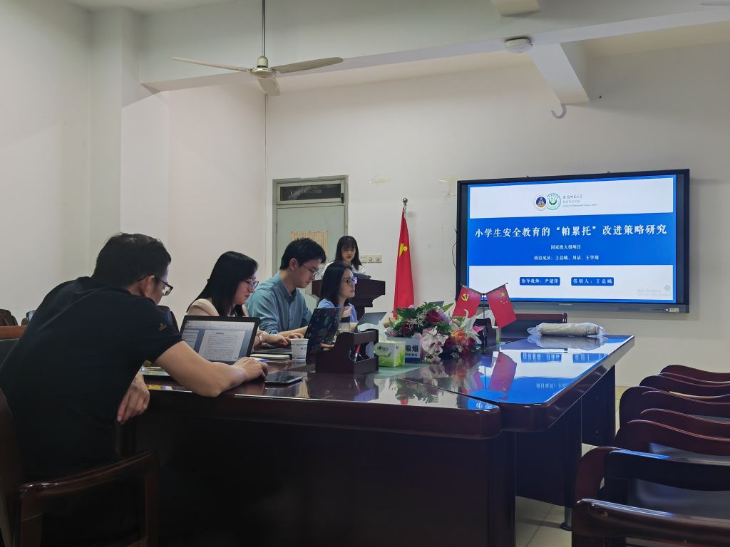 本次答辩会共有8个项目小组参加,其中4个国家级项目,4个省级项目,实现了大创项目“人人参与、全班覆盖”。项目选题多样,涉及小学生安全教育、劳动教育、高校师范生实习运行机制、高校教师信息化教学等。现场答辩流程分为PPT陈述、专家提问、学生作答三个环节,各项目汇报人从项目背景、研究内容、项目成果等方面进行汇报。