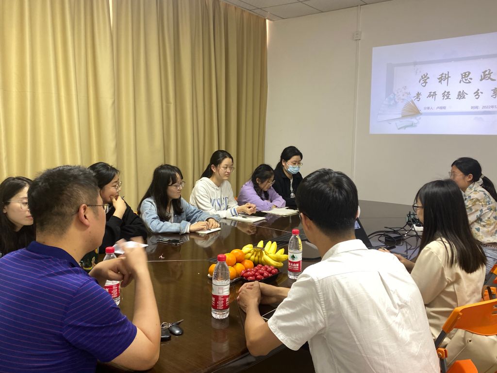 5月21日下午,2019级教育学专业在研究生会议室举办跨考类考研经验交流会。辅导员莫大贡,马克思主义学院思想政治教育专业2018级本科生卢程程、吴建军和2019级教育学专业跨考思政和学科思政的同学参加交流会,会议由莫大贡主持。