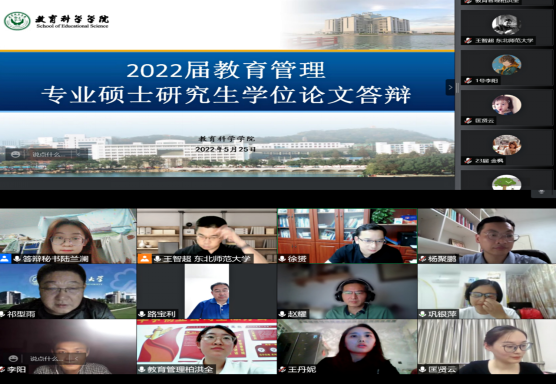 2022年5月25日,教科院教育管理专业研究生迎来了学位论文答辩。因处疫情时期,本次答辩依托腾讯会议平台,采用线上方式进行。答辩邀请了沈阳师范大学博士生导师祁型雨教授、东北师范大学博士生导师王智超教授,安徽师范大学博士生导师路宝利教授、陕西师范大学硕士生导师杨聚鹏副教授以及安徽师范大学附属小学副校长赵耀组成了答辩专家委员会。教育管理全体研究生通过线上方式观摩了此次答辩会。