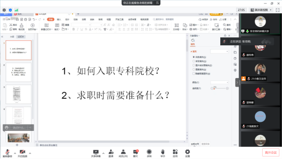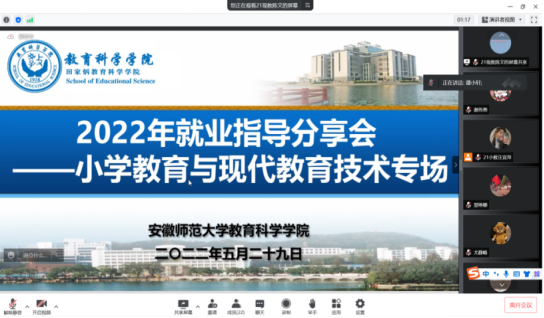 5月29日晚,学院通过腾讯会议平台针对2022届毕业生们开展了小学教育与现代教育技术专场就业指导分享会,研究生辅导员谭茹轩参加了此次会议,近30名硕士研究生在线交流学习,分享会由院研究生会校友部成员汪宜萍主持。