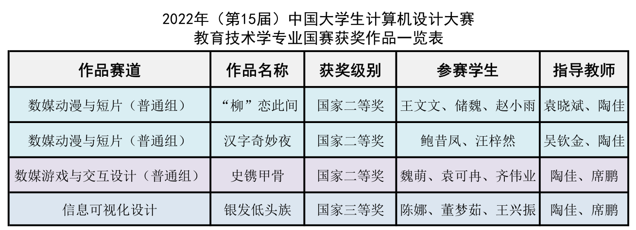 本网讯(教科院 赵小雨 席鹏)近日,第15届中国大学生计算机设计大赛全国总决赛圆满落幕,我院教育技术学团队在本次大赛中共斩获国家二等奖3项,国家三等奖1项,国赛获奖作品数占全校获奖总数的1/3,刷新了我院在该项赛事的最好成绩,同时获奖级别和数量连续两年领先全校其他学院。