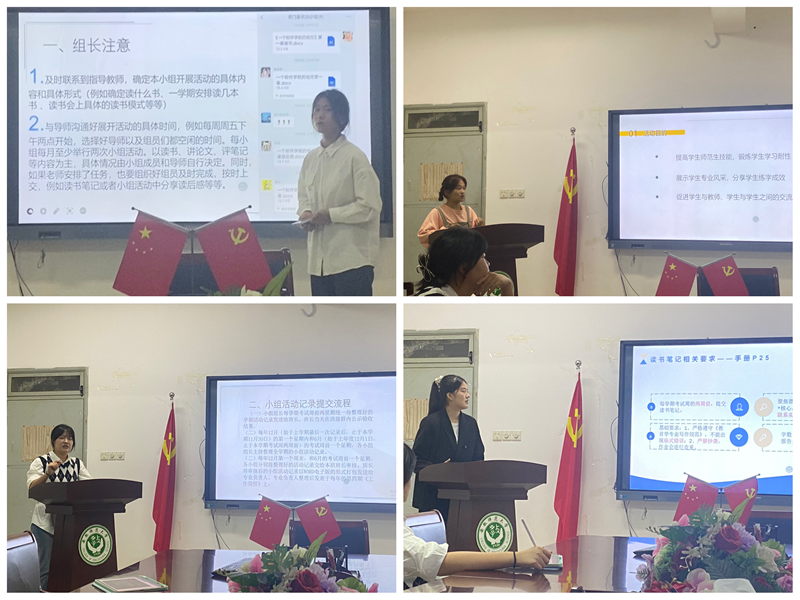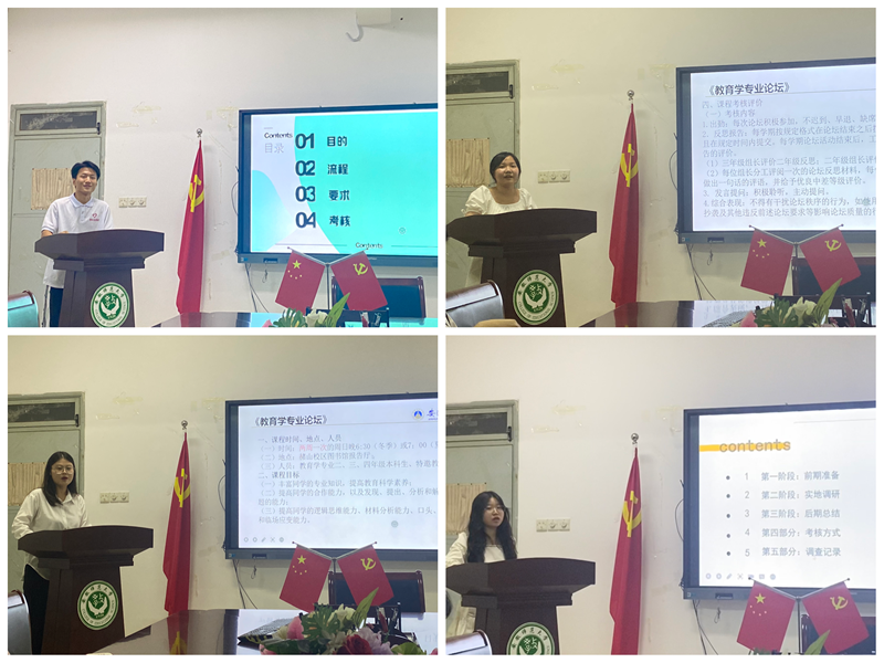 第四项是社会实践调查报告,纪升从自身社会实践经历出发,表明社会实践活动具有丰富假期生活、深化专业知识与技能、掌握简单的社会实践调查方法的作用,并重点介绍了该项活动的流程、要求和考核事项。第五项是《教育学专业论坛》课程实施方案,马祎曼主要介绍了专业论坛课程的基本信息和具体流程。叶秀清围绕课程考核评价和反思报告的撰写展开说明。第六项是《教育调查》课程实施方案,江宇翼从前期准备、实地调研、后期总结、考核方式、调查记录五个阶段对课程的内容做出详细介绍。