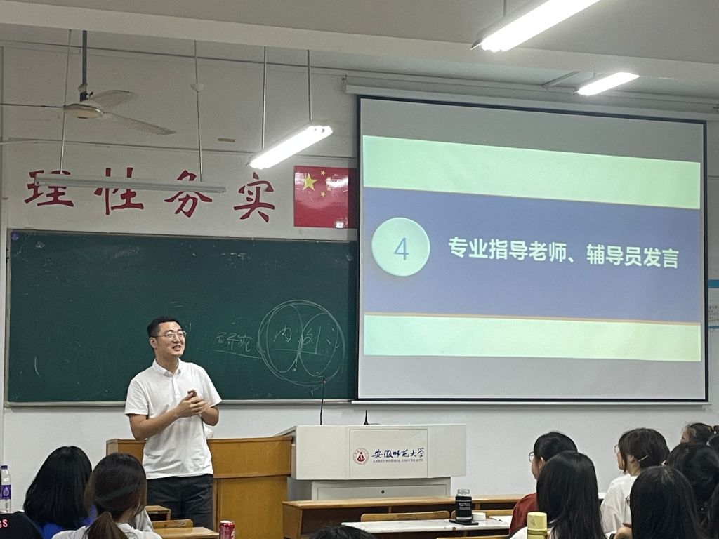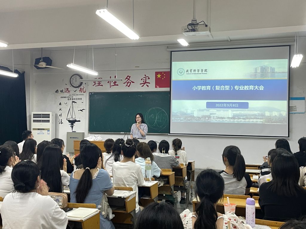本网讯(教科院 赵文韬)为进一步加深学生对专业人才培养方案的了解,提升专业认同,使其对未来专业学习有更明确的目标和方向,21级小学教育(复合型)专业于9月8日晚在田楼8203教室举行专业教育大会。小学教育(复合型)专业负责人陈娜、专业指导老师肖龙、21级辅导员赵茜、19级学生代表江宇璇和吴君瑜以及21级小教(复合型)专业全体学生参与此次会议。会议由陈娜老师主持。