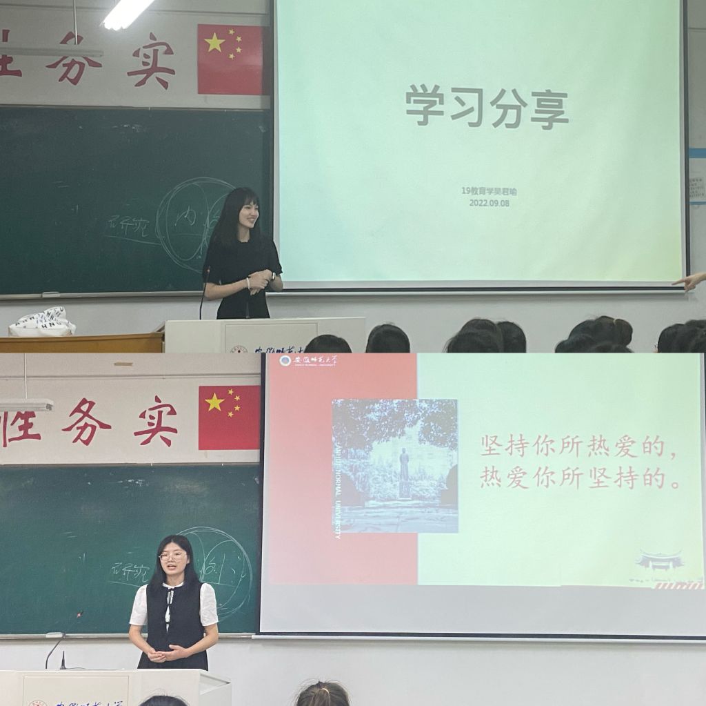 会议共有五项内容。专业负责人陈娜老师从培养目标、课程设置、教学方法、专业特色活动等方面介绍小学教育(复合型)专业人才培养的基本安排,重点强调了专业强大的师资力量、丰富的特色实践活动以及创新的、多样化的教学方法,使学生对该专业学习和自身成长发展有更清晰的了解。指导老师肖龙结合自己的理解向大家简要阐述小学教育(复合型)专业的有关事项。他指出,小学教育(复合型)专业是一个培养高素质、专业化、创新型小学教师的专业,其中蕴含了学院对大家的学习与发展期待,并表示自己会尽力做好专业指导老师,期盼与学生一起共同成长。19级小学教育优秀学生代表江宇璇和19级教育学优秀学生代表吴君瑜分别与同学们进行了学习经验交流。江宇璇以图片和视频的形式,从专业课程和实践活动两个方面为同学们展示了小学教育专业化的课程教学以及丰富多彩的实践活动。吴君瑜结合自己的学习经历,从专业课学习、考研、学习方法等方面与大家分享了自己的学习经验。经验分享全面、丰富,契合同学们的学习需求,深受同学们的欢迎和赞同。