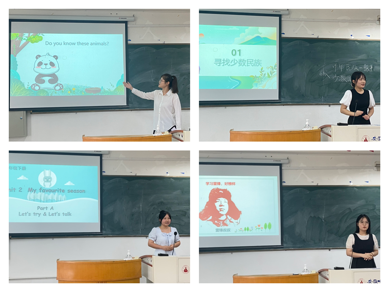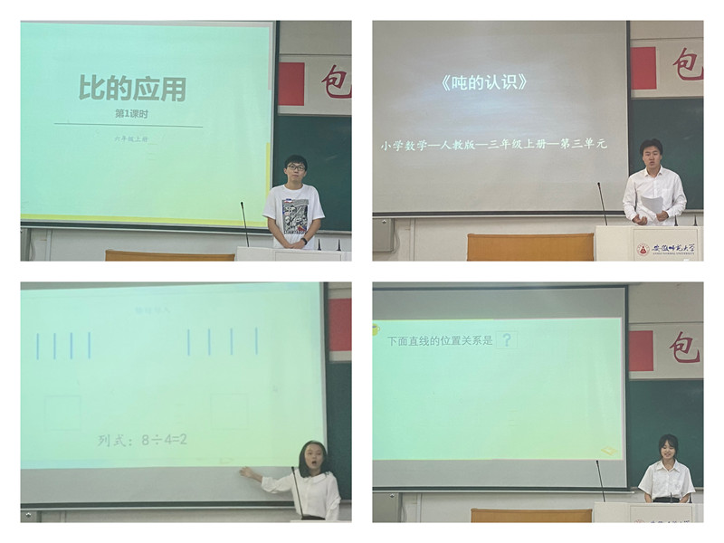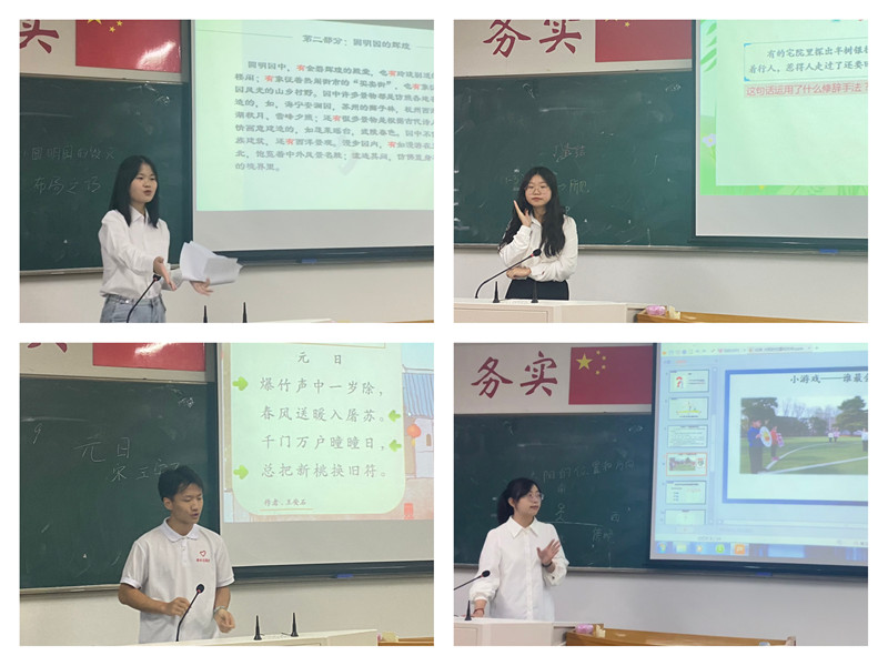 参赛选手赛前准备充分,根据自身情况选择了不同主题,涉及学科范围广泛,授课方式多样。如钱鑫授课《吨的认识》时语言幽默风趣,并结合生活实际,带领大家认识数学美;马祎曼的全英文教学流畅且富有感情,通过唱歌、借助教具等形式增加课堂教学的趣味性;纪升以铿锵有力的声音带领大家学习古诗《元日》,并对生字词进行详细讲解与板书;纪岚通过游戏活动的形式展开科学教学,带领大家深刻感受与认识太阳的位置和方向等。整场比赛过程中,选手们的教学思路清晰,语言生动精炼,教学内容丰富多彩,教学过程生动有趣,教学技能扎实牢固,板书美观合理,课堂魅力各具特色,赢得了评委老师和在场同学们的一致喝彩。