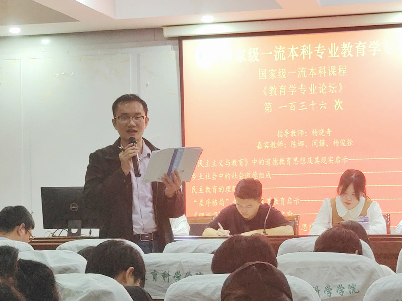 本次专业论坛王悦晓小组以读书笔记作为汇报主题,围绕《民主主义与教育》、《乡土中国》、《理想国》三本经典名著展开探讨。第一位汇报人王甜甜以《〈民主主义与教育〉中的道德教育思想及其现实启示》为题,从原则、主要目的、内容、方法四个方面对杜威的道德教育思想进行阐释,并指出道德教育的“四应”,应以人为本、以生为本,应回归生活、回归社会,应避免空洞说教,应重视隐性教育。第二位汇报人王琪森以《乡土社会中的社会道德组成》为题,从社会格局和社会权力探究乡土社会的道德组成,并思考得出社会道德运用于班级管理的建设性观点。第三位汇报人江钰仪依照《民主教育的理解和解读》的主题进行汇报,首先论述作者简介、成书背景和理论基础,接着概括书中各章节内容以及核心观点,最后提出评价与建议。