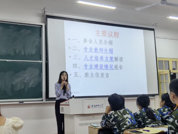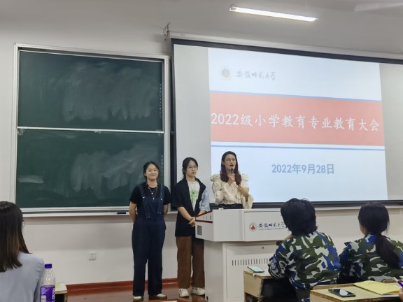 首先,王芳老师介绍参会人员并向到场的老师和同学们致以诚挚的问候。王芳老师先向同学们介绍了小学教育专业教师团队,让同学们目睹各位教师的风采。随后,王芳老师为同学们详细解读了《小学教育专业人才培养方案(全科型2022版)》,要求同学们按照培养方案要求自己,努力学习,为国家乡村教育事业献出自己的一份力量,厚植国家乡村教育情怀。然后,王芳老师报告了小学教育专业建设情况,包括专业建设历程、目标、成效以及反思和展望。