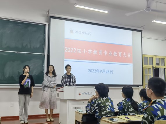 本网讯(教科院 刘子怡)9月28日晚7:00,365英国上市官网在教学楼1401教室召开2022级小学教育(全科型)专业教育大会,专业负责人王芳老师,班主任陈元龙老师、吴颖老师和杨俊铨老师,9位班导生和2021级优秀学长、学姐代表以及2022级小学教育专业全体新生参加大会。大会由王芳老师主持。