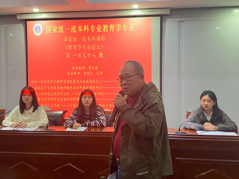 本网讯(文/谢雅雯 乔琳颖 图/谢雅雯)10月23日晚,在365英国上市官网三楼学术交流中心,国家级一流本科专业建设点教育学专业顺利举办第一百三十八次专业论坛。莅临本次专业论坛的有小组指导教师周兴国以及嘉宾教师李宜江和位涛,20级、21级教育学专业全体本科生到场参加,并由20级教育学马祎曼担任主持人。