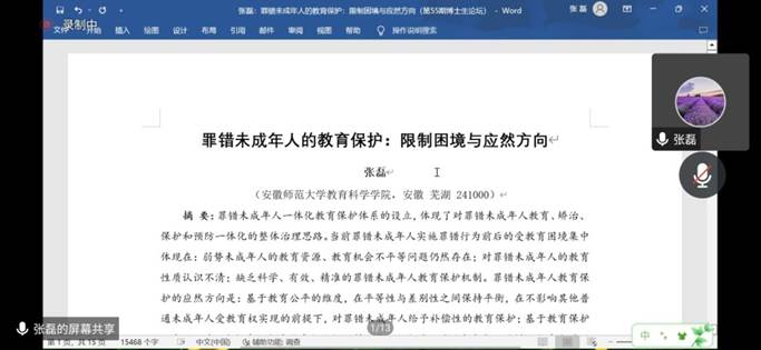 张磊同学汇报内容:文章包括三个部分,主要的研究方向是未成年人的犯罪预防。第一部分罪错未成年人概念的发生考察。把这个罪和错合在一起之后,是准备用法治去严惩这些少年,还是想要用教育疏解的方式来对待他们?第二个部分罪错未成年受教育困境的描述性分析,集中体现在:弱势未成年人的教育资源、教育机会不平等问题仍然存在;对罪错未成年人的教育性质认识不清;缺乏科学、有效、精准的罪错未成年人教育保护机制。第三个部分罪错未成年人教育保护的应然方向:基于教育公平的维度,在平等性与差别性之间保持平衡,在不影响其他普通未成年人受教育权实现的前提下,对罪错未成年人给予补偿性的教育保护;基于教育保护理念的维度,在惩戒权与受教育权之间保持平衡,融合对于罪错未成年人的矫治教育与普通教育;基于教育保护机制的维度,在适当的惩或与适合的教育之间保持平衡,建立从轻到重教育;基于教育保护机制的维度,在适当的惩戒与适合的教育之间保持平衡,建立从轻到重三级保护体系,实现行政与司法双重干预的恰当衔接。